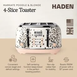 Add a touch of elegance to your kitchen with the Haden Margate Poodle & Blonde 4-Slice Toaster. This limited-edition toaster, featuring the signature Tottenham Dalmatian print, brings luxury and retro charm to your countertop. Its pale pink and chrome details blend seamlessly with any decor, making it an attractive addition to your kitchen.This toaster’s extra-wide slots can handle various bread types, from thick bagels to artisanal slices. With 6 browning levels, you can customize your toast to your preferred shade, ensuring a satisfying crunch every time. The high-quality stainless steel construction promises durability and a sleek, timeless look.Start your day with delicious toast, effortlessly achieved with this toaster. Its cancel, defrost, and reheat settings offer versatile toasting options. Whether you’re defrosting a bagel or heating a slice of bread, this toaster handles it all with precision. The removable crumb tray makes clean-up quick and easy. Its intuitive controls and user-friendly interface turn your morning routine into a delightful experience. The compact design fits easily into any kitchen space, while the vibrant print adds personality.Ideal for busy mornings or leisurely brunches, this 4-slice toaster combines style and function. Its unique design and practical features make it an excellent gift for loved ones or a special treat for yourself. Enjoy consistent performance and timeless style every day with the Haden Margate Poodle & Blonde 4-Slice Toaster.