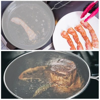 - The fine mesh on each frying pan splatter guard helps prevent grease, oil, sauce, or any other liquid from splashing out onto your stovetop while you are cooking