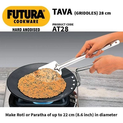 Premium Quality Hard Anodized 11″ Tava Griddle for Everyday Use Cook delicious parathas in an efficient manner using the Prestige Futura hard anodized tava griddle. Compatible with gas stovetops, this griddle is ideal for everyday use in the kitchen. The concave bottom and hard anodized material enables faster and even cooking which results in crispier and tastier food. Made from Robust Material, Built to Last Build using hard anodized aluminum, the Prestige Futura tava is built to last for a long time and can withstand the rigors of daily use. The durable material and scratch resistant surface also enables the use of metal ladles and spoons, providing further ease of use. It features a sturdy handle that stays cool even while cooking, making it easy to handle. Available in a unique black color, this griddle can retain its looks for years to come. Its elegant design helps in improving the overall look and feel of your kitchen décor.