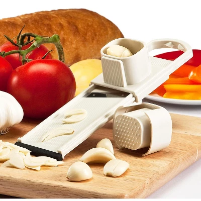 The Hutzler Garlic Slicer and Shredder is a mini-mandolin for slicing garlic and ginger. One side slices, the other side shreds. Features a rubber non-slip base.