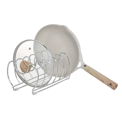 Upgrade your kitchen cabinet organization with the iDesign Classico Cookware Organizer. This innovative cookware holder features six divided sections to provide convenient storage and access to pans, skillets, lids, cutting boards, and more. The non-slip PVC feet keep the organizer in place and protect surfaces from scratches and damage, and the versatile design can be used on countertops or in cabinets to help declutter your kitchen and pantry. Designed with style and function in mind, the durable steel construction with polished chrome finish stands up to every day use and matches a variety of decor styles. Measuring 13.2″ x 6.35″ x 5.17″, this cookware storage rack is ideal for adding organization in compact spaces. With iDesign by InterDesign, you can #LiveSimply every day.