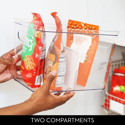 The foundation for an orderly kitchen starts with function and the iDesign Crisp Divided Organizer will be a worthy addition to your storage solutions. Equipped with a removable divider, this no-fail organizer sorts and stores snacks, food pouches, seasoning packets, and other pantry staples, allowing you to categorize items by size, shape, or use. Its crystal-clear construction and open-top design allows for instant visibility and easy label identification, simplifying item location and retrieval. Use multiple units together or separately for custom organization. With iDesign, you can live simply every day.