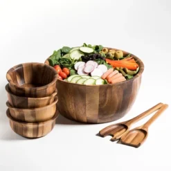 - Kalmar Home’s exquisite 7 piece Large Acacia Wood Salad Bowl Set includes a generously sized salad bowl, complete with matching serving utensils and four individual serving bowls, perfect for gatherings with family and friends.