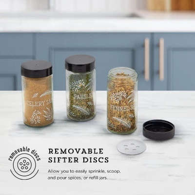 - REMOVABLE SIFTER DISCS AND GLASS JARS: Discs allow you to easily sprinke, scoop or pour your spices and refill jars. Glass jars are clearly labeled to easily identfy your needed spices.