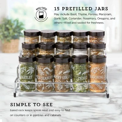 - INCLUDES: 3-tier wire spice rack, 15 glass spice jars filled with spices, labeled black caps and sifter discs