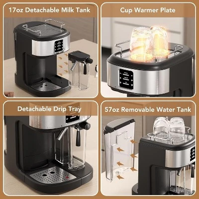 - 【Large Tank、Detachable & Cleans Easy】With a removable 57oz large capacity water tank, our cappuccino machine eliminating frequent refills. The 16.9oz milk container is detachable and stores easily in the refrigerator to keep milk fresh between uses. All water tanks and stainless steel drip pans are detachable for minimal cleanup.