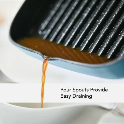 - MODERN COLOR FINISH: Cast iron grilling pan features a sleek blue velvet enamel exterior with a matte black enamel interior to hide wear and tear for kitchen to table presentations