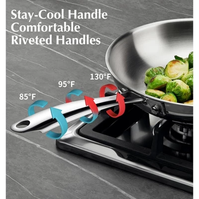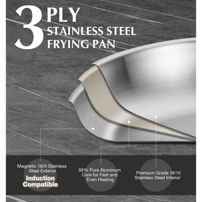 KOCH SYSTEME CS Tri-Ply Clad Fry Pan is perfect to sear, brown, and pan fry. The Tri-Ply clad construction (18/10 stainless steel, aluminum core, magnetic stainless steel) provides exceptional performance, distributing heat quickly and evenly without hotspots, this cookware heats from all sides and not just the bottom! Combines the impeccable beauty and durability of premium 18/10 stainless steel and was designed to withstand repeated usage, even in the most demanding kitchens. The ergonomic precision cast mirror-polished stainless-steel riveted handle construction offers a comfortable, secure grip. The fry pan is dishwasher-safe, oven-safe up to 500°F (260°C), and compatible with all cooktops, including induction.