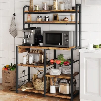 SpecificationsColor: Brown/Black/GrayMaterial: Metal/MDF BoardOverall dimension: 15.7″ X 35.4″ X 57.1″(L x W x H)Weight capacity of Table: 150 lbsPackage includes: 1 x Bakers rack/1 x Instruction