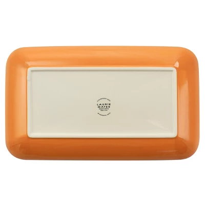 The Laurie Gates Tierra Serving Platter is beautifully hand painted with vibrant colors and a unique floral design. This rectangular serving tray will make add a pop of color to your appetizers and will be a statement piece at any dinner party. Constructed with durable stoneware that is both dishwasher and microwave safe for easy clean up and reheat. This platter is the perfect medium size at 14.8in length by 8.5in width. Serve crackers and cheese, fruits, veggies, and more on this colorful tray!