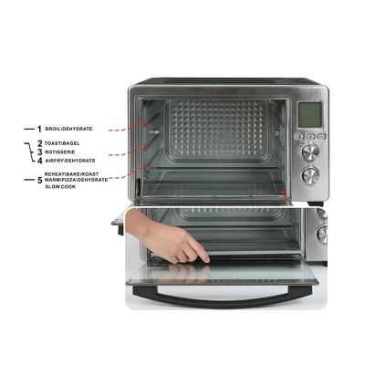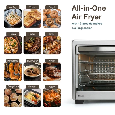 - Extra versatile LCD digital display with 12 cooking functions: air fry, bake, rotisserie, dehydrate, toast, reheat, roast, broil, bagel, pizza, slow cook, and warm reheat