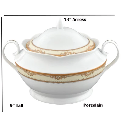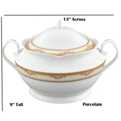 This elegant porcelain soup tureen has durable quality with a delicate and exquisute look. The Isabella pattern by Lorren Home Trends features an elegant and stylish gold border trim design on curved and scalloped shaped tureen. Soup tureen capacity is 4.25 quarts or holds 136 ounces and measures 13″ x 9.5″ x 9″. Hand wash only. Great vessel to serve hot or cold foods. Compliments our Isabella dinnerware collection perfectly.