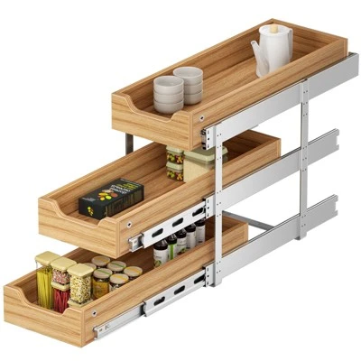 - 3 Tier Pull Out Wood Drawer: Our 3-tier pull out cabinet shelf can create larger storage space in a small cabinet. You can make full use of your cabinet space and can also store tableware, kitchen appliances, canned goods, cleaning products and other items in layers. Each layer can be pulled out separately, making use of space more flexibly.