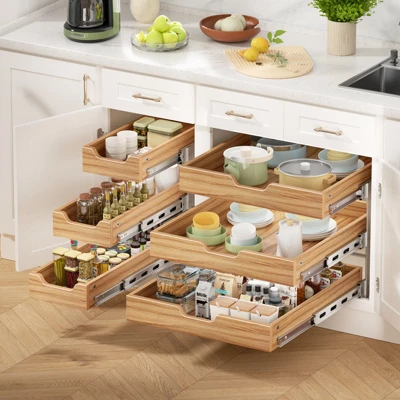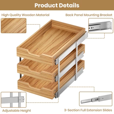 3 Tier Pull Out Wood Drawer: Our 3-tier pull out cabinet shelf can create larger storage space in a small cabinet. You can make full use of your cabinet space and can also store tableware, kitchen appliances, canned goods, cleaning products and other items in layers. Each layer can be pulled out separately, making use of space more flexibly.