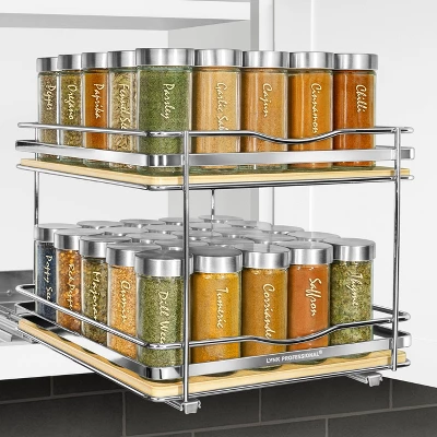 This versatile two-tier pull out wood and chrome spice rack gives you easy slide out access to all your spices in your kitchen cabinets and pantries and is ideal for narrow cabinets. Our spice and seasoning organizers are engineered with chrome-plated steel construction and durable laminated wood shelves to give you unparalleled strength and durability for a lifetime of trouble-free use. Our ProGlide® Plus 2™ industrial-grade full-extension dual ball bearing glides ensure smooth sliding and are designed to clear any cabinet lip. Our exclusive design adjusts to extend up to an extra 2” further than ordinary full-extension glides, ensuring a perfect fit and complete access to all spices and bottles even in deeper upper cabinets. No need for special jars, you can keep your herbs and spices in their original containers. And our proprietary Easy Mount® design requires no measuring and installs in minutes – just 2 screws (included); no need to remove shelves. This pull out spice rack holds up to 50 standard size spice jars (jars not included). US Patents Pending Product Dimensions: 10-1/4″ W x 10-1/4″ to 12-1/4″ inch deep x 9-3/16″ H. Alternative names our customers use to find our product: spice racks for inside cabinets, pantry spice organizer, cabinet pull out shelves, spice rack organizer for cabinet with jars, condiments organizer kitchen for cabinet, roll out shelves for kitchen cabinets, spice rack for cabinet door, spice jar organizer, sauce organizer for cabinet.