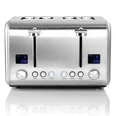Features 9 adjustable preset browning settings perfect for all your different breakfast creations. Brushed stainless steel housing is easy to clean and care for and matches every kitchen decor. LED screen shows how much time is left on your selection. Includes convenient slide out crumb tray allowing for quick and easy cleaning.