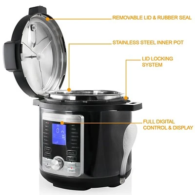 The MegaChef 6 Quart Stainless Steel Electric Digital Pressure Cooker with Lid lets you cook to your heart’s content with 14 built in programmable features. The digital display shows cooking time, button indicator lights, and one-touch settings for easily adjusting time, temperature, and pressure. The brushed stainless steel exterior and removable interior allows for easy cleaning and durability. The easy pressure release valve and convenient carry handle includes a locking feature, making it both safe and easy to transfer. Replace your pressure cooker, slow cooker, food steamer, rice cooker, and soup maker with just one electrical appliance!