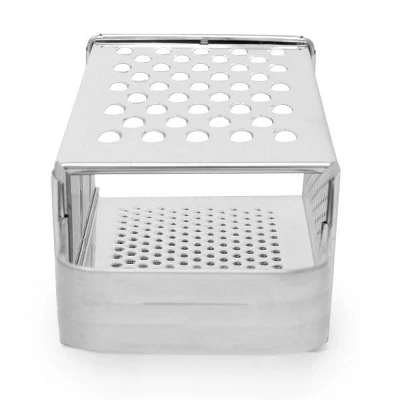 Perfect for a multitude of kitchen uses, this four-sided grater is an excellent addition to any kitchen!Includes: coarse shred, medium shred, fine shred/zester, and slicer!Quickly shred a large block of cheese or potatoes for hash browns with minimal effort. Ideal for soft and hard cheeses, fruits and vegetables, chocolate, garlic, ginger, nuts, and much more!Also great for zesting citrus!Stainless steel construction. Measures: 9.25″ x 4.25″ x 3.25″ / 23.5cm x 11cm x 8cm.Perfect for a multitude of kitchen uses, this four sided grater is an excellent addition to any kitchen!Includes: coarse shred, medium shred, fine shred/zester, and slicer!Quickly shred a large block of cheese or potatoes for hash browns with minimal effort.Ideal for soft and hard cheeses, fruits and vegetables, chocolate, garlic, ginger, nut,s and much more!Stainless steel construction. Measures: 9.25″ x 4.25″ x 3.25″ / 23.5cm x 11cm x 8cm.