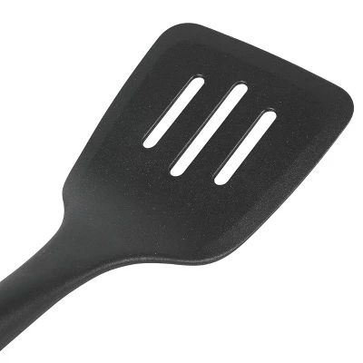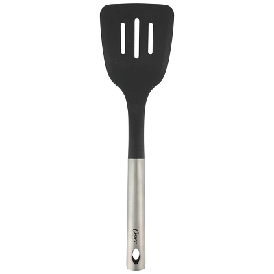 Designed to make food prep and cooking an easy and enjoyable experience, the Oster Baldwyn collection offers handy kitchen tools and gadgets for everyday use. The Oster Slotted Nylon Turner has a heat-resistant nylon head that easily slides under food when frying, baking or sautéing. The slotted design drains excess oil or liquids from patties, eggs, and more. It is safe to use on nonstick cookware or any delicate finishes without scraping and scratching. It works well on ceramic or conventional nonstick surfaces and pre-seasoned and enameled interiors. Stir, flip, and serve using the lightweight stainless steel handle for a safe and ergonomic grip. Dishwasher safe.