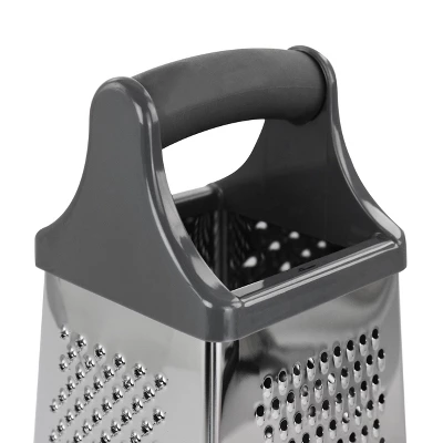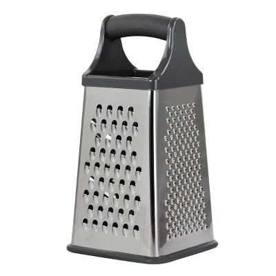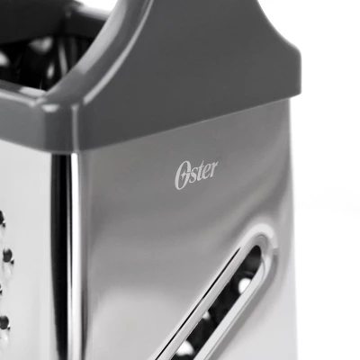 The Oster four sided stainless steel box grater is the compact kitchen gadget that every kitchen needs. This grater has a soft to the touch and grip-able handle as well as a no-slip rubber base for heightened stability while in use. Stainless steel four sided grates are durable and designed with multi function in mind. Sharp blades help shred vegetables, hard cheeses, and other foods with ease. Sides provide a course, medium, fine, and slicing surface for different uses.