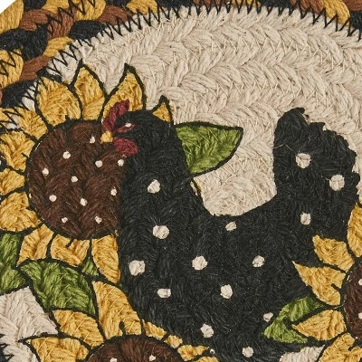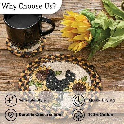 This circular woven trivet set of six perfectly captures the rural countryside charm! Featuring a primitive printed pattern, this kitchen textile set has a rooster with polka dots that is beautifully framed by vibrant sunflowers and an orange, yellow, and black braided border. Whether you’re hosting a cozy dinner with loved ones or relaxing in the living room, these patterned round trivets effortlessly enhance any coffee table or dining table decor with its bold and inviting colors. Features a multipurpose design for functional use during everyday cooking routines with pots and pans, while also adding a fun flair to a variety of interior home styles or a charming housewarming gift basket. The rustic design perfectly complements primitive, country, fall, summer farmhouse decor, and more!
