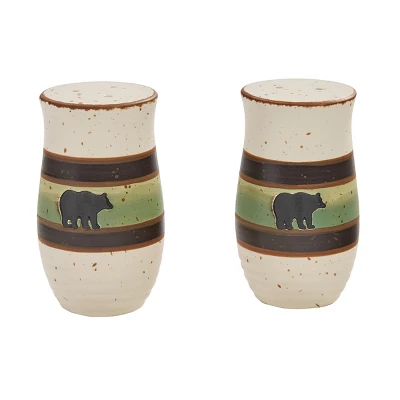 - Material: This rustic-styled Skyline Salt And Pepper Set is made of high quality ceramic stoneware, featuring a speckled ground with a beautiful green skyline and debossed black bear. Each include rubber stoppers underneath to make refilling a breeze. This set makes a perfect addition to your home for gatherings, or for general use in the kitchen all year long!