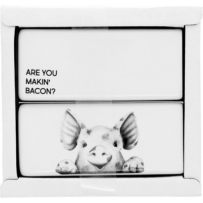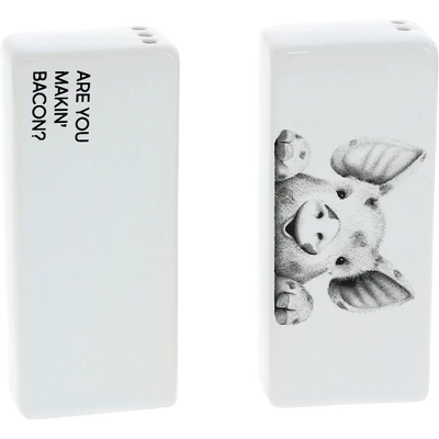 The “Are You Makin’ Bacon?” Salt & Pepper Shaker Set is part of the quirky Animal Antics Collection by Katherine Sheard, celebrated for its humorous and whimsical animal-themed designs. Made from durable stoneware, each shaker measures 3.5″ x 1.5″ x 1″ and comes with a convenient rubber bottom plug for easy refilling, ensuring both practicality and long-lasting use in your kitchen. Featuring a playful pig illustration alongside the cheeky phrase “Are You Makin’ Bacon?,” this set adds a fun and lighthearted touch to any kitchen. Its detailed artwork is perfect for fans of farm-themed decor, combining humor and charm to create a unique addition to any space. The design is both functional and decorative, making it a great choice for those who love playful and distinctive kitchen accessories. As part of the broader Animal Antics Collection, this set is ideal for collectors or those searching for a fun and quirky gift. The collection offers a range of items, including mugs, kitchenware, home decor, and more, all featuring Katherine Sheard’s signature humorous animal designs. Whether you’re adding to your own collection or shopping for someone special, the Animal Antics series provides memorable and enjoyable pieces for every occasion. This salt and pepper shaker set is packaged in a clear acetate band and housed in a protective white die-cut box, making it ready for gifting. The shakers are also dishwasher safe, ensuring easy cleaning and maintenance. With its blend of whimsical design, functionality, and quality craftsmanship, the “Are You Makin’ Bacon?” Salt & Pepper Shaker Set is perfect for adding humor to your kitchen or giving as a delightful gift. Don’t forget to explore other Animal Antics items to complete your kitchen or gift collection!