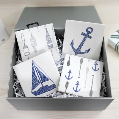 Embrace lakeside tranquility with the Lake 4″ Ceramic Coaster Set, perfect for anyone who loves spending time by the water. This set of four ceramic coasters showcases meticulously designed lake-inspired motifs, including a sailboat, anchor, and fishing buoys, all rendered in cool blue tones to evoke the peaceful ambiance of a lakeside retreat.