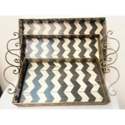 Essential Decor & Beyond Decorative Rectangular Metal Tray With Handle: Black And White Chevron Pattern – 3PC