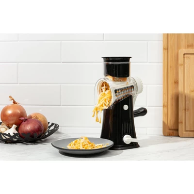 - 5 Interchangeable Drums: Choose from a variety of blades to suit your needs on this versatife lightweight cheese grater and vegetable chopper—thin slicing, wavy slicing, coarse shredding, julienne, and fine julienne. These blades allow you to prepare everything from perfectly sliced veggies to finely shredded cheese, giving you versatility for all your meal prep tasks.