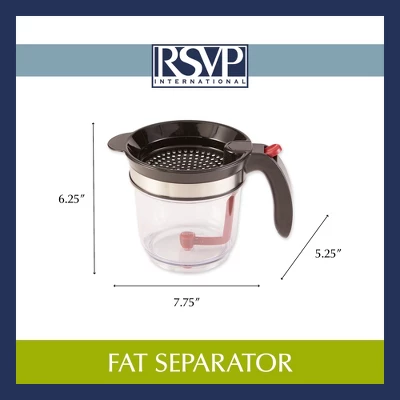 - Fat Separator dimensions are 5.25×7.75×6.25-inches (LxWxH). Capacity is a generous 32 ounces (4 cups). Made with BPA-free plastic, food grade silicone and stainless steel. Built in strainer catches unwanted solids.