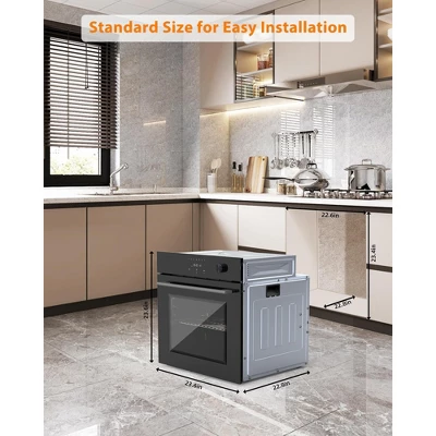 - 【Spacious and Flexible 2.5 CU.FT Cooking Capacity】This 24-inch single wall oven offers a generous 2.5 cubic feet capacity, providing ample space for large meals or multiple dishes. With 5 adjustable side racks, this electric oven offers the flexibility to bake, roast, or grill with ease, accommodating a variety of cooking needs and ensuring you have room to cook for the whole family.