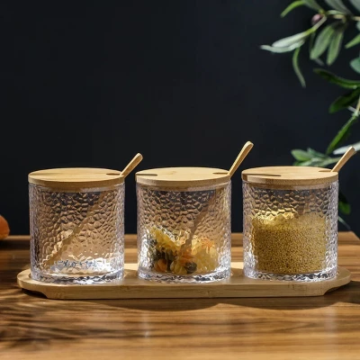 - Set of 3 hammered glass condiment jars