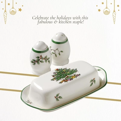Add a festive touch to your holiday gatherings with the Spode Christmas Tree 3-Piece Hostess Set, an essential addition to any Christmas or Thanksgiving table. Featuring an 8-inch butter dish with lid and matching 3-inch salt and pepper shakers, this set showcases the beloved Christmas Tree pattern with beautiful accents of holly and mistletoe. The Spode Christmas Tree Hostess Set also makes an ideal Christmas gift. Crafted from fine earthenware, each piece is both durable and decorative, making it suitable for regular use throughout the holiday season. The bright white finish and green trim provide an elegant backdrop that complements other holiday dinnerware collections, ensuring your table is beautifully set for family and guests alike. Whether you’re hosting a large gathering or enjoying a cozy dinner, this hostess set is sure to impress.For collectors, this set is a cherished addition to the iconic Spode Christmas Tree collection, offering the opportunity to grow or start a meaningful tradition. Designed with practicality in mind, the set is dishwasher safe, ensuring quick and easy cleanup after your holiday celebrations. Make this holiday season even more special with the Spode Christmas Tree 3-Piece Hostess Set, a versatile and festive addition to your table.