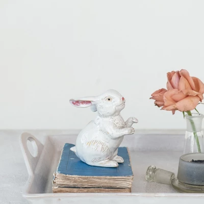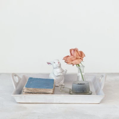 - A stoneware tray that exudes antique charm, complete with functional handles and a classic white finish