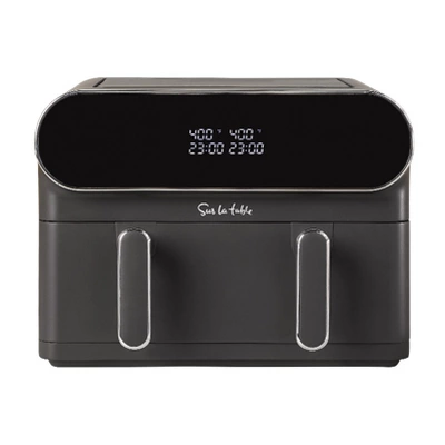 The Sur La Table 7-in-1 Dual Basket Air Fryer with Dual IsoHeat™ Technology. This versatile air fryer is changing the way you cook meals. You can use the large 11qt basket for one family meal or a whole chicken or use the basket separator (included) to make 2 5.5qt large capacity baskets that allow you to cook 2 different foods at the same time.