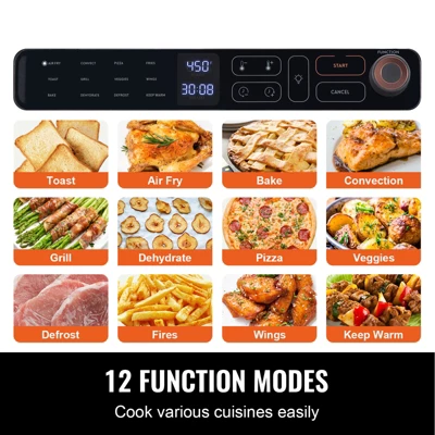 12-in-1 Function: The VEVOR convection oven combines a toaster oven, bread maker, and air fryer into a single appliance, with 12 different cooking modes. You can bake bread, desserts, roast meats, poultry, and air fry all your favorite foods, making cooking fun and easy from the comfort of your own home!