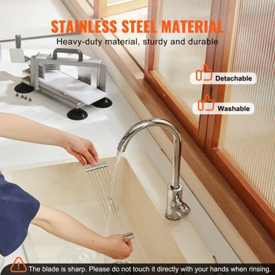 High Stability: Featuring a heavy-duty stainless steel body and 4 suction cup feet, this commercial tomato slicer can adapt to various tabletop surfaces, protecting your countertops and ensuring the device stays in place for smoother slicing operations.
