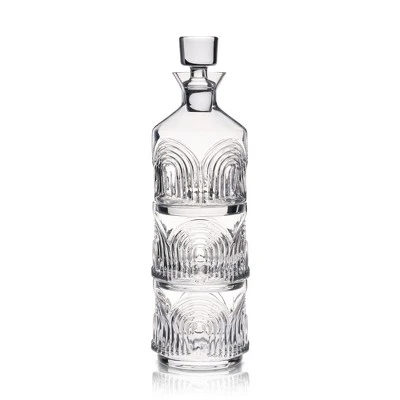A repeating rainbow motif pressed into lead-free crystal gives these textured tumblers Art Deco decadence. Paired with a matching petite liquor decanter, this stackable barware saves space on your bar cart and adds some Gilded Age style to your glassware collection.Quantity: 2 glasses, 1 decanterMaterials: Lead-free crystalCapacity: 11 oz. glasses, 14.5 oz. decanterCare: Dishwasher safe
