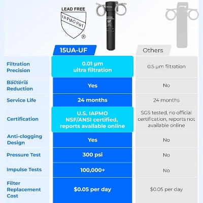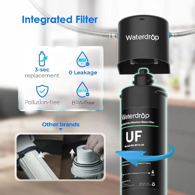 About this item· 【Compatibility】 Suitable for faucets with 1/2″ or 3/8″ FEMALE NPT thread. If a female threaded connector is needed to connect to your faucet, please contact us BEFORE purchase.· Less than $36.99 per replacement filter WD-RF15-UF, save over 50% of cost on subsequent use.· Compatibilityl: Suitable for your kitchen faucets with 1/2″ or 3/8″ FEMALE NPT thread. NO Faucet Included in Package. If a female threaded connector is needed to connect to your faucet, please contact us BEFORE purchase.· Superior Material: With a filtration accuracy of 0.01 μm, the Ultrafiltration membrane filters out most of baçtёria larger than 0.01 μm. Activated carbon block and other advanced filter media ensure efficient and safe filtration. Specially selected premium materials are lead-free. The BPA-free, lead-free material ensures more reliable use from the inside out.· Solve Clogging Problem: By upgrading the filtration area, our filter now provides a 20X increase in dirt adhesion area, enhancing filtration capability while minimizing the risk of clogging.· Innovative Multistage Filtration: The Waterdrop Direct Connect Under Sink Water Filter System uses innovative multistage filtration. Tested by third party laboratory against NSF/ANSI 42 standard, the water filter can effectively reduce chlorine, taste and odor. And it can effectively reduces heavy metals, chemical iṁpurity, sediment and other large particles.[1] Tested by third party laboratory against NSF/ANSI 53 standard it can reduce lead. No need to buy bottled water anymore!· Easy Installation: The system should be connected only to a cold water supply. With innovative push-to-connect fittings, the entire installation process takes less than 3 minutes. The twist-and-lock design ensures that you can replace the filter in 3 seconds. The system includes a 3/8” hose with a direct connection that adapts to standard 3/8’’ feed water valves under US sinks. The 3/8″–1/2″ convertor fitting helps you connect the system to both 1/2″ and 3/8″ cold water lines and faucets.· Ultra-Long Service Life: When used with municipal water, each filter has a maximum service life of 24 months or 16,000 gallons.[2] Thus, you won’t need to replace the filter nearly as often as you would with pitcher and faucet water filters. For better filtration, we recommend that you replace the filter every 24 months.