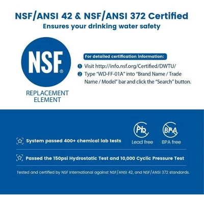 About this itemUltra clean water: The upgraded material and exclusive multi-stage filtration enables effective reduction of lead, chlorine, and other contaminants to deliver fresh and crisp water.(Tested by third party laboratory)NSF certifications: Tested and certified by NSF International against NSF/ANSI standard 42 for the reduction of chlorine, taste and odor, and to NSF/ANSI 372 for lead-free material. Provides you with safer and healthier water.Highly adsorptive material: Highly adsorptive Activated Carbon Fiber (ACF) for efficient contaminants reduction and fast adsorption speed. Each filter delivers 3 months or 320 gallons of clean and fresh water, 2x longer than many other products, helping save your wallet.Fast and stable flow rate: Our outstanding 0.5 GPM Hi-Flow rate allows an instant access to large amount of filtered water. 4 water bottles (16.9oz) can be filled within 1 minute. Simple design makes it easy and quick to change the cartridge. No pre-soaking is required.Replacement models: This filter is compatible with Waterdrop Faucet Filtration System, WD-FC-01, WD-FC-02, WD-FC-03, WD-FC-06.