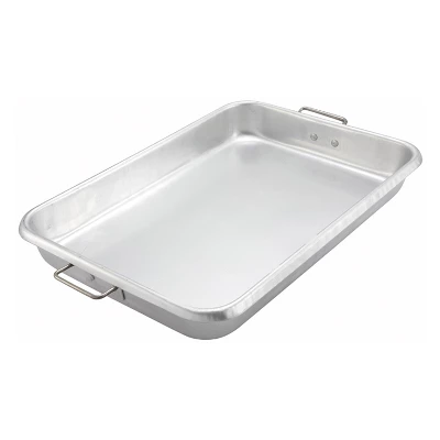 Aluminum pan for baking and roasting without Handles, built to withstand commercial use. The Winco ALRP-1826H is a rectangular roasting pan constructed of durable 12 gauge aluminum. Perfect for oven roasted poultry, meat and vegetables, this roast pan is an excellent choice for commercial chefs. Convenient and durable, this pan is built with loop handles for a secure grip.