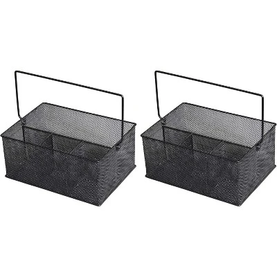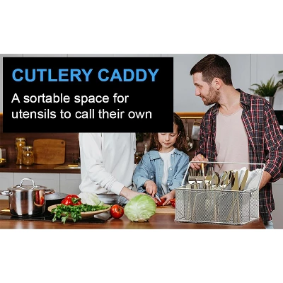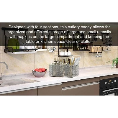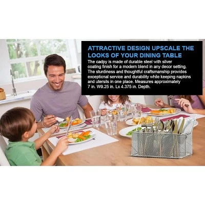 - MESH UTENSIL & CONDIMENT CADDY – Serve and display your utensils, napkins, and condiments on the dining table with this four compartment mesh utensil caddy – featuring a carrying handle to keep silverware and sauce supplies upright and accessible
