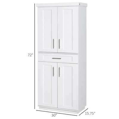 Transform your home organization with the Yukimo 30″ White Modern Kitchen Pantry Cabinet, offering exceptional storage solutions with stylish functionality. This freestanding pantry features two spacious cabinets with four doors, a convenient utility drawer, and four shelves including three adjustable shelves that customize to your storage needs. The clean white finish and modern design seamlessly blend with various decor styles, making it perfect for use in dining rooms, living areas, studies, or kitchens. Constructed from durable P2 particle board and P2 MDF, this cabinet ensures easy maintenance and long-lasting durability while supporting up to 154 pounds total weight capacity. The anti-toppling design provides added safety and stability, and can be securely fixed to the wall for extra protection. With overall dimensions of 30 inches wide, 15.75 inches deep, and 72 inches high, this pantry offers substantial storage space while maintaining a compact footprint. The adjustable shelving system allows you to create customized storage configurations or remove shelves entirely for larger display items. Assembly is required with all necessary hardware and instructions included. Backed by Munora’s commitment to quality and customer satisfaction, this versatile storage solution combines practical organization with contemporary style for modern homes.