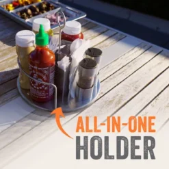 All in one holder. Holds condiment bottles, spices, cutlery and napkins for an all-in-one solution, keep your BBQ space clean and organized with our steel condiment holder. Premium stainless steel ultra-strong and durable our condiment holder can be used outside, inside, and everywhere in between. comes with a hanging hook and 360-degree rotating base for easy placement and access. Tons of room 3 cutlery compartments, 2 Glass spice jars, space for 4-5 Bottles, napkin holder.
