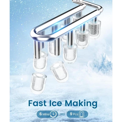 - 6-Min Fast Ice Making – This ice makers countertop has upgraded new compressor, which can produce 9 ice cubes in just 6 minutes and generate up to 26.5 lbs of ice per day. The ice machine maker countertop provides two sizes of clear ice cubes to choose from.