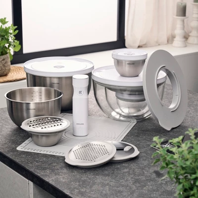 (No Container included) Power through prep with the ZWILLING FRESH & SAVE Bowls—the comprehensive vacuum system that’s thoughtfully designed with a suite of accessories that make prepping, baking, and serving more efficient.Designed to work with the Fresh & Save bowls, our collection of accessories eliminate the need for additional kitchen tools by letting you grate directly into the bowl. The patented Z-Cut lid inserts feature sharp, 2-way cutting functionality that shreds and slices cheese and vegetables directly into the bowl. The splash guard keeps ingredients from splashing while mixing or whisking, reducing messy countertop splatter. And the non-slip silicone mat features precise measurements for accurate measuring, and a smooth surface for heat-safe, nonstick baking.