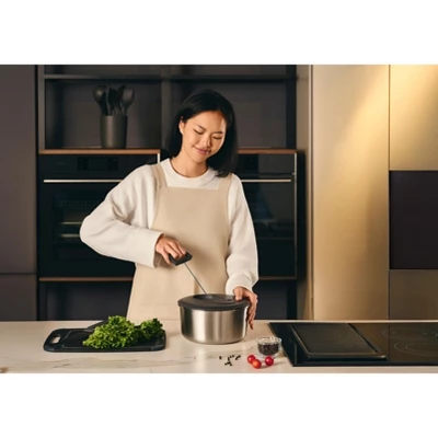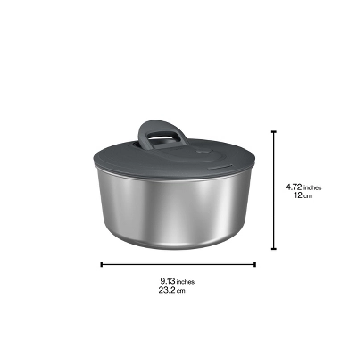 The Zyliss Easy Spin Salad Spinner Stainless Steel S is designed to make your salad prep faster, easier, and more efficient. Equipped with our patented AquaVent technology, this spinner quickly dries 2-4 portions of salad or vegetables by rapidly extruding water, leaving your greens crisp and fresh. The innovative AquaVentTM basket is cleverly designed to extract water through the vents faster and more efficiently and includes small gaps to easily grab and lift it from the bowl. The lid features a compact, foldable handle with a magnetic clip ensures effortless storage. It’s retractable cord and brake system allow for quick removal of excess water, while the stop button fluffs your salad to perfection. The pouring spout can be used to drain excess water without removing the lid, and the non-slip base offers added stability during use. The elegant stainless steel bowl doubles as a serving dish, letting you serve your freshly prepared salad directly at the table. Easy to clean, the lid separates, allowing the dishwasher-safe bowl, basket, and clutch plate to be placed in the dishwasher. With a timeless and compact design that incorporates up to 10% wheat straw material in the lid, the Easy Spin Salad Spinner Stainless Steel S combines eco-consciousness, style, and functionality for a modern kitchen essential.